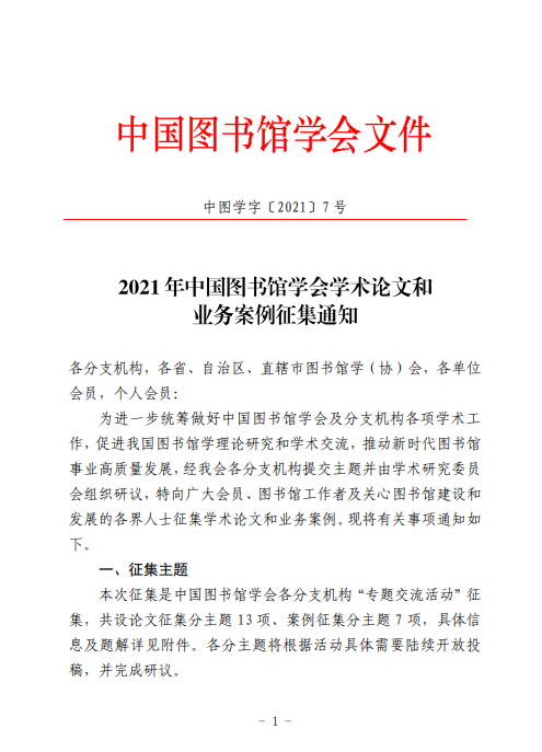 2021年中国图书馆学会学术论文和业务案例征集通知