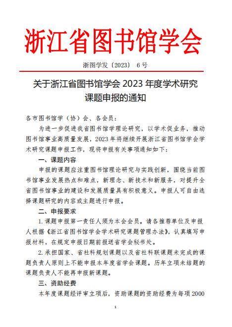 关于浙江省图书馆学会2023年度学术研究课题申报的通知
