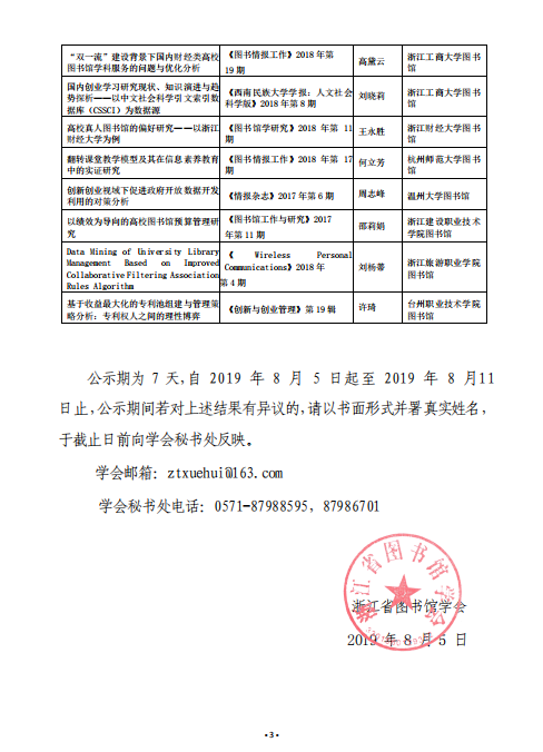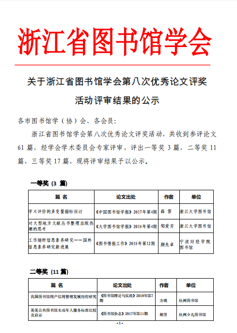 关于浙江省图书馆学会第八次优秀论文评奖活动评审结果的公示