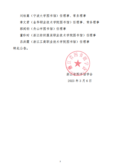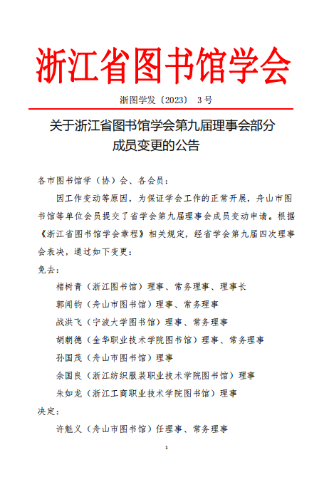 关于浙江省图书馆学会第九届理事会部分成员变更的公告