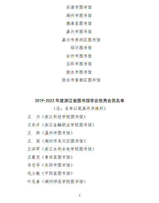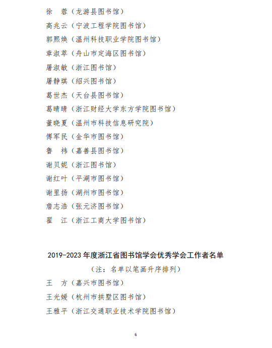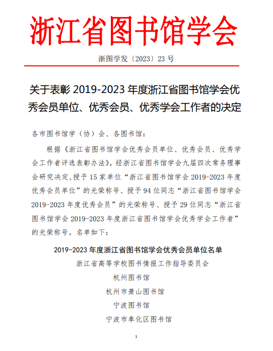 关于表彰2019-2023年度浙江省图书馆学会优秀会员单位、优秀会员、优秀学会工作者的决定