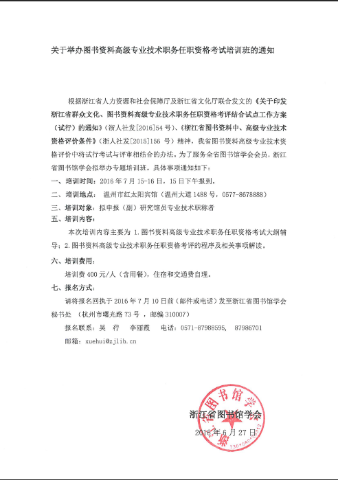 关于举办图书资料高级专业技术职务任职资格考试培训班的通知