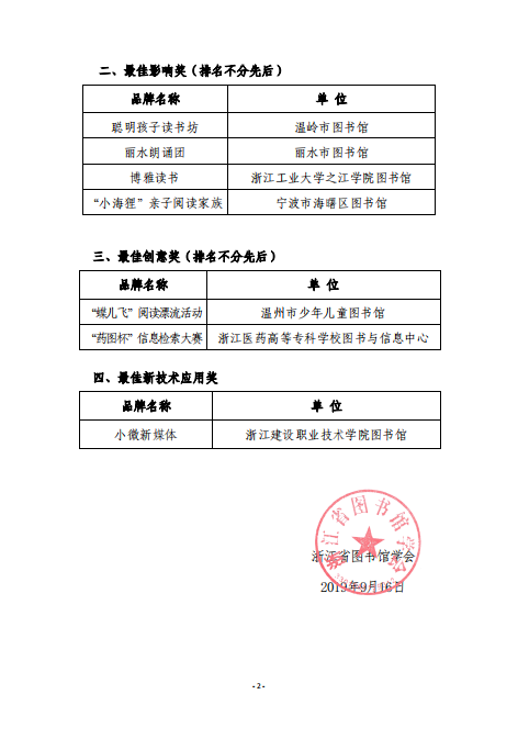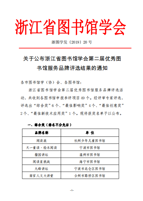 关于公布浙江省图书馆学会第二届图书馆优秀服务品牌评选结果的通知