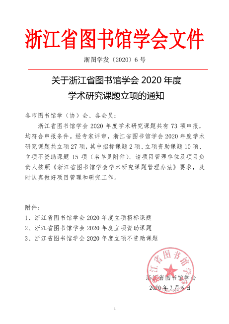 关于浙江省图书馆学会2020年度学术研究课题立项的通知