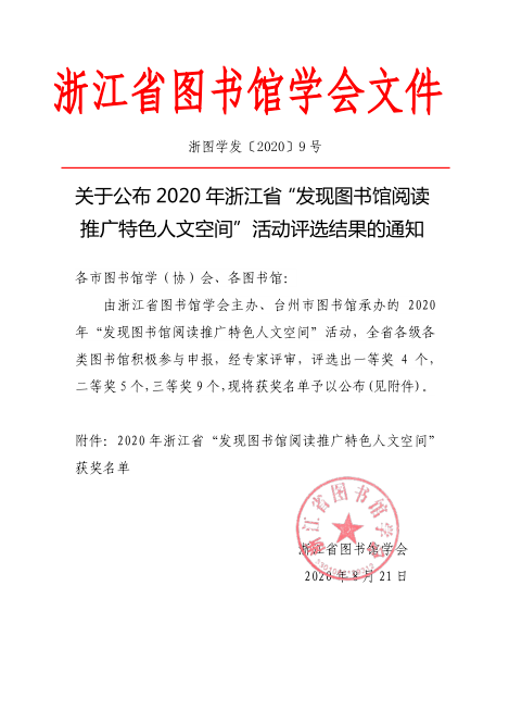 关于公布2020年浙江省“发现图书馆阅读推广特色人文空间”活动评选结果的通知