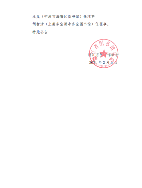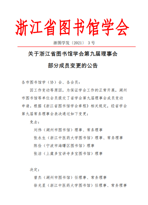 关于浙江省图书馆学会第九届理事会部分成员变更的公告