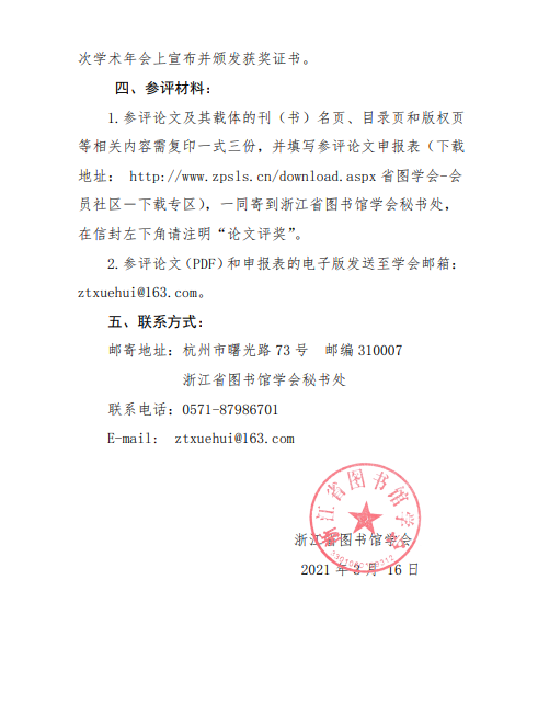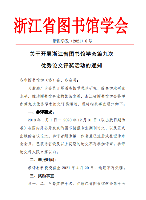 关于开展浙江省图书馆学会第九次优秀论文评奖活动的通知