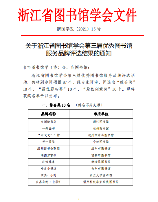 关于公布浙江省图书馆学会第三届“优秀图书馆服务品牌”评选结果的通知